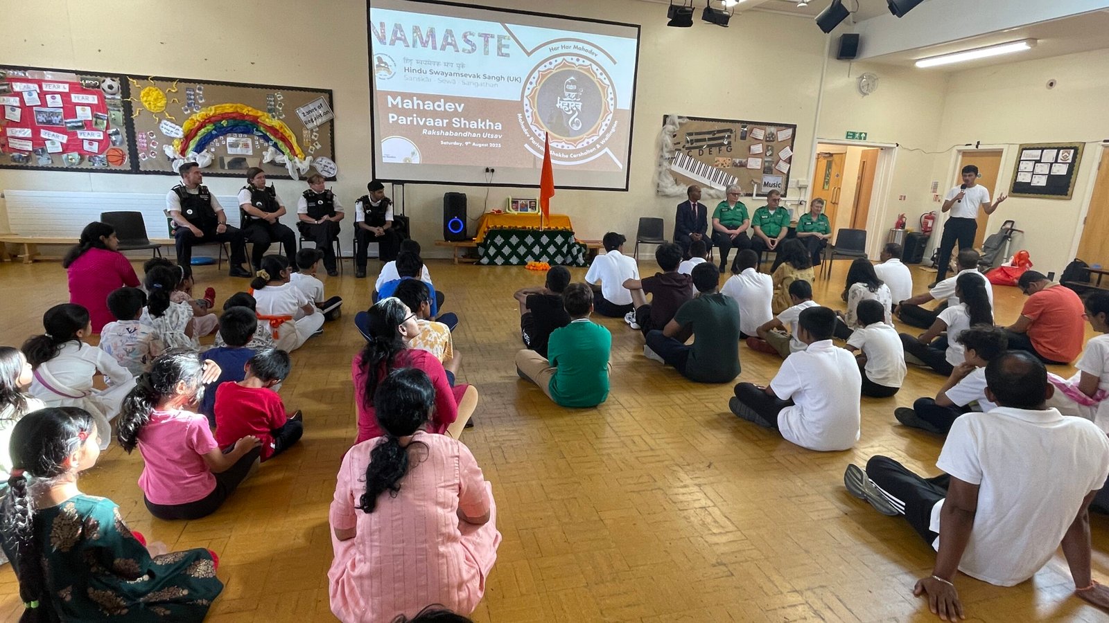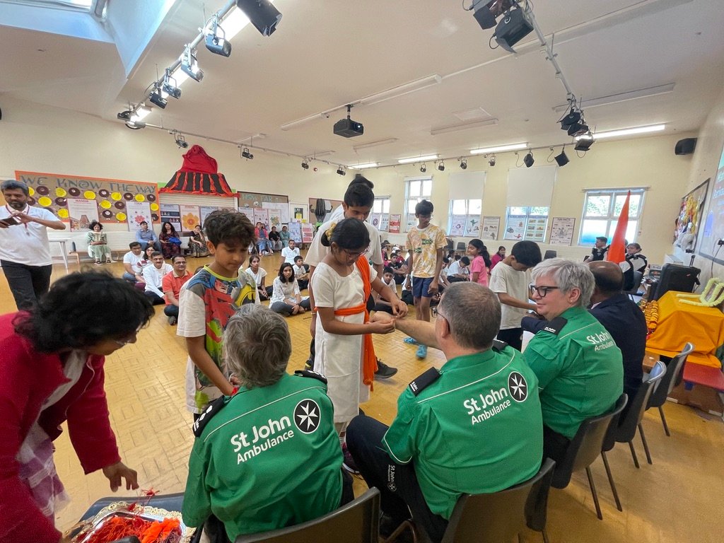 The annual Raksha Bandhan celebration hosted by HSS (UK) Carshalton Branch, brought together community members and local emergency responders in a vibrant display of unity and service.