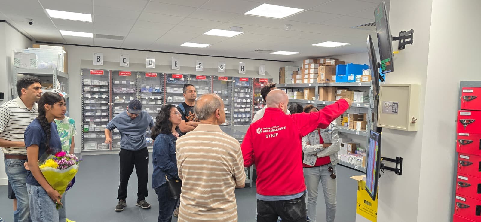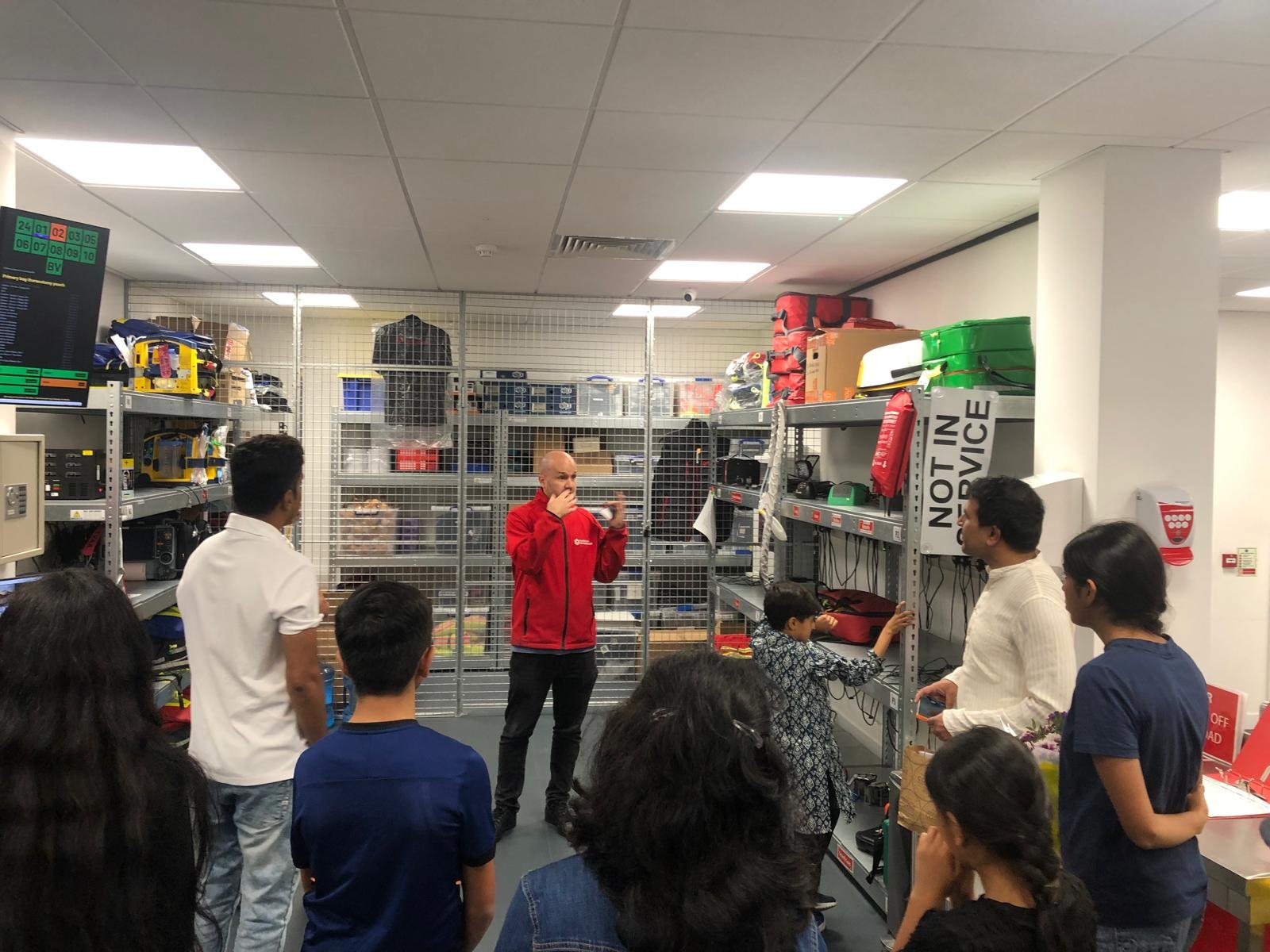 Although most of the paramedics were out responding to emergency calls when the group arrived, the team kindly arranged a fascinating behind-the-scenes tour of the facility. Participants were shown the equipment room where specialist medical bags and emergency kits are stored, ready to be deployed at a moment’s notice. Each bag is carefully prepared for different types of emergencies, including cardiac arrest response, airway management, trauma care, and treatment for severe bleeding.